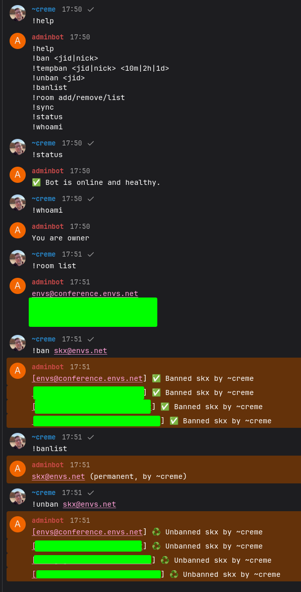 Hi everyone, I've written a small bot based on SlixMPP. :) BanBot is an XMPP bot for managing bans and temporary bans in multiple MUC (Multi-User Chat) rooms. It allows centralized administration from a designated admin room and protects multiple chat rooms from unwanted users. REPO: https://git.envs.net/envs/muc_banbot